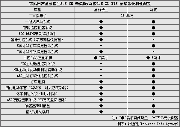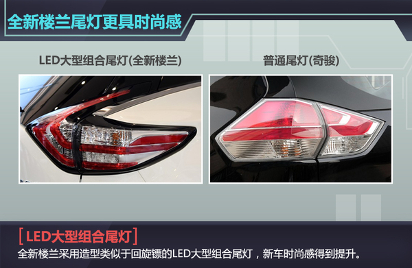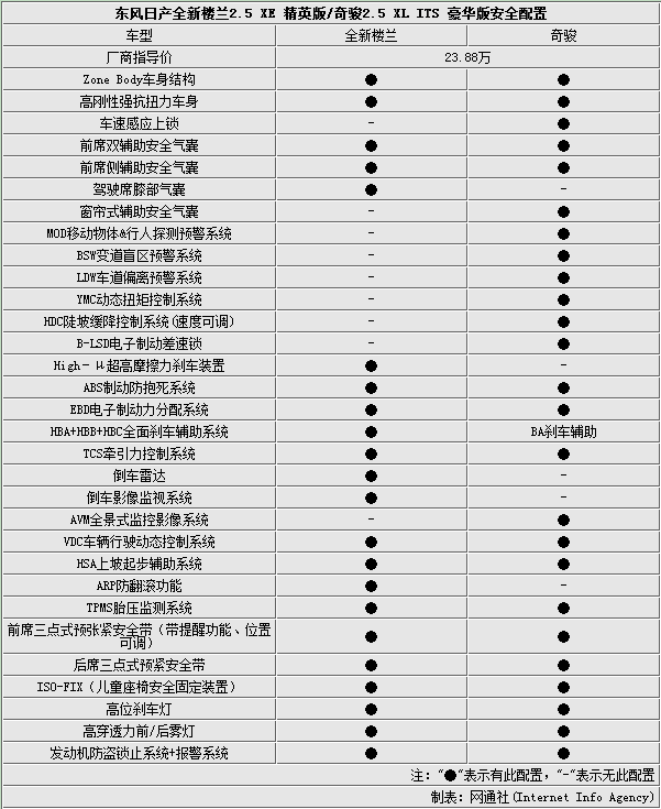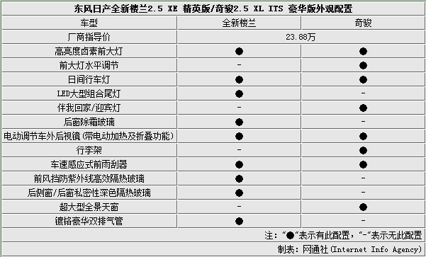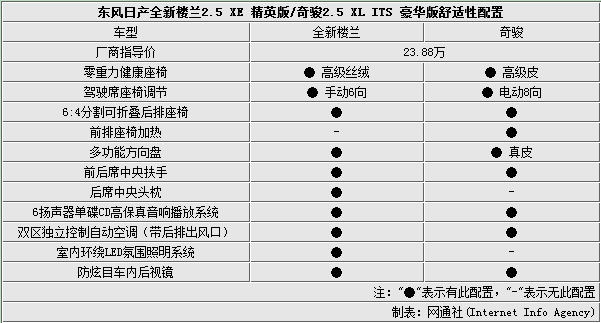 总结:通过本文可以发现,全新楼兰2.5 XE 精英版和奇骏2.5 XL ITS 豪华版在售价、动力输出、百公里综合油耗和座椅布局等方面基本相同,但在车身尺寸和内部乘坐空间方面全新楼兰2.5 XE 精英版优势明显,而在车型配置方面,尤其是安全配置,奇骏2.5 XL ITS 豪华版则更有优势,这两款车型该如何选择,还是需要看更追求车内乘坐空间还是更追求车型配置。(网通社 2015年8月12日 北京报道)