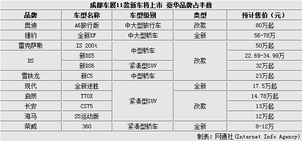 即将在此次成都车展上市的新车型中,包括5款SUV和6款轿车,其中捷豹全新一代XF、全新途胜以及荣威360是全新和换代车型,其余8款车型则是中期改款和年度改款车型,并以新增全新发动机的车型为主,例如新款DS5、新款DS6以及新C5等车型。