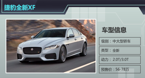 捷豹全新一代XF在外观造型进行了全面升级,并基于iQ全铝车身平台打造,新车整备质量比现款降低了190kg,抗扭刚度提升了28%。此外,全新一代XF轴距也大幅加长了51mm,达到2960mm。在动力方面,全新XF先期将搭载一台3.0L V6机械增压发动机,随后还将推出动力更强的3.0L V6双增压发动机和搭载Ingenium系列2.0L涡轮增压发动机的入门车型。与之匹配的是ZF 8速手自一体变速箱。