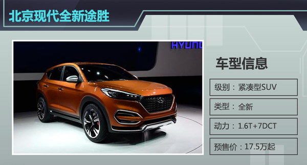 北京现代在北京车展上发布的全新途胜,即将于9月5日在成都车展开幕期间正式上市。据了解,全新途胜定位在ix35与全新胜达之间,将作为ix35的换代车型,替代现款的途胜车型。在动力方面,将提供1.6T、2.0L直喷两款发动机,其中1.6T涡轮增压发动机,最大功率为132.4kW,峰值扭矩达265Nm,匹配7速双离合变速箱。此前全新途胜公布的预售价为17.5万元起,在同级别车型中非常具有竞争力。