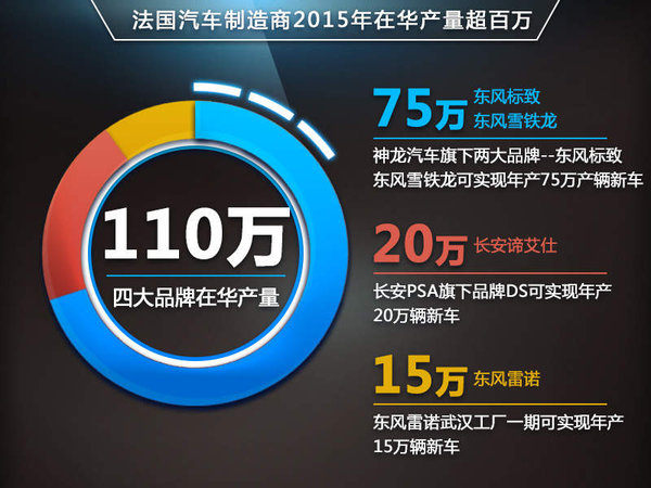 随着法国汽车制造商在华销量不断增长,对于中国市场未来的发展也在不断加码。网通社查阅相关资料后获悉:2015年长安PSA将形成20万辆整车产能;东风标致与雪铁龙总产能为75万辆;东风雷诺武汉工厂竣工后也将达到15万辆的年产能,由此法系品牌在华总产能将超百万,这也标志着法系车在华将进入新的发展阶段。