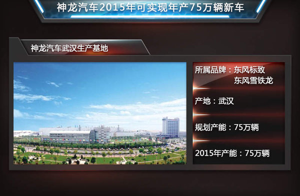 神龙公司拥有两大品牌——东风雪铁龙和东风标致,旗下共有两个基地、四大工厂,其中成都第四工厂正在建设之中。神龙公司襄阳基地是发动机、变速箱等动力总成生产基地。武汉生产基地包括一厂、二厂和三厂,具备多品种柔性化生产的三大整车专业厂,目前具备年产60万辆的整车生产能力。到2015年,三大工厂将形成年产75万辆以上整车生产能力。