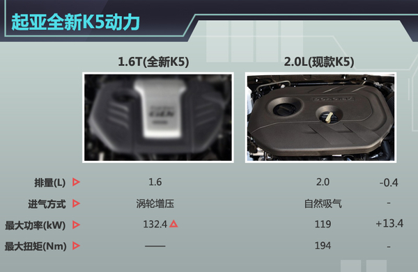 东风悦达起亚现款K5搭载2.0L自然吸气发动机和一款2.0T涡轮增压发动机,与全新K5同平台打造的北京现代第九代索纳塔已经率先搭载1.6T增压发动机,全新K5则紧随其后,这款发动机动力输出强劲,通过与现款K5搭载的2.0L自然吸气发动机进行动力对比可以发现,前者在最大功率方面具有优势,而最大扭矩数据虽未公布,但从第九代索纳塔搭载的1.6T发动机数据来看其最大扭矩数据大幅超越2.0L发动机。