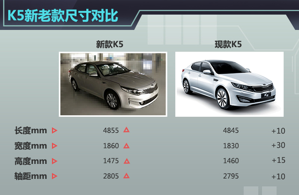 东风悦达起亚现款K5的车身尺寸分别为4845mm、1830mm、1460mm,轴距为2795mm,全新一代车型在此基础上进行了全面增大,在保证更好的空间利用率的前提下,车型定位与K4也更加明显。作为东风悦达起亚旗下旗舰轿车,全新一代K5与现款车型相比无论在车身尺寸还是在动力总成上都将令该企业品牌形象得以大幅提升。