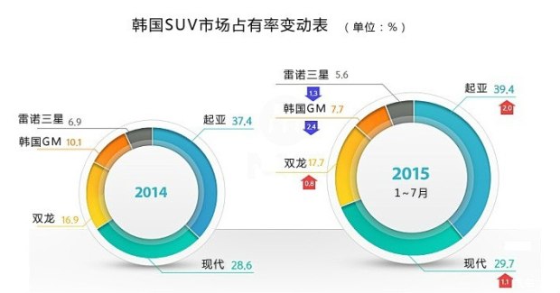 今年1-7月,韩国国内SUV销量是29万8400辆,同比(23万2121辆)增加了28.6%。而轿车的销量同比下降了9.6%。说明SUV车型在韩国正在受到追捧,并成为韩国车企的新利润增长点。截止到7月份,现代·起亚在韩国SUV的销量是20万6034辆。两家企业的市场占有率达到69%。