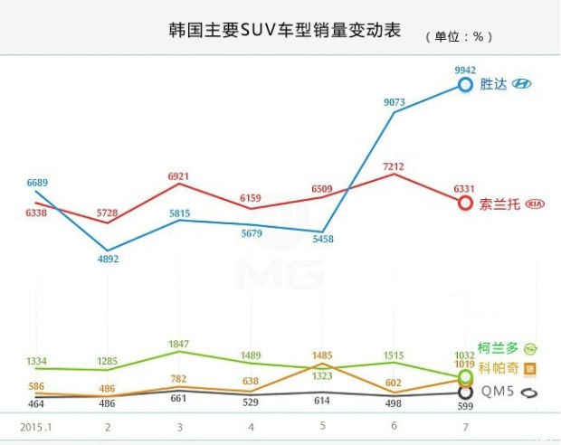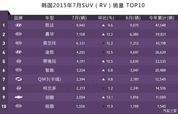 从韩国SUV市场占有率变动表上也能看出以下特点:1.起亚汽车超过现代,成为韩国市场上SUV车型的霸主。起亚汽车1-7月份累计销量11万7537辆。SUV与轿车的生产比例从过去的66:34,变成如今的54:44。在韩国,SUV通常是与RV的销量算在一起的。因此嘉华帮了起亚的大忙。2.现代·起亚集团内部的SUV车型都是同平台,因此两个品牌占据了大部分市场份额。新款途胜的上市并没有在韩国引起轩然大波,如今SUV的销量冠军是胜达。3.实力最弱,在轿车市场没什么作为的双龙汽车在SUV市场表现不错,上市不久的蒂维拉功不可没。此外,双龙汽车从小型SUV到大型SUV有完善的产品线。