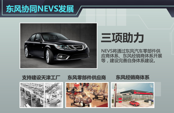 按照NEVS和东风汽车的战略合作协议,双方将积极推动纯电动车和增程式电动车的研发,利用NEVS的整车平台、东风汽车采购和营销资源,加快双方在新能源汽车领域的协同发展。对此,NEVS董事长蒋大龙表示:“NEVS经历了收购萨博、在华投产等很多磨难,如今已峰回路转,在中国发展纯电动车是必然的发展趋势。”