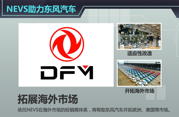 东风汽车作为NEVS的战略合作伙伴,也将得到后者的技术支持,帮助东风汽车自主品牌产品针对海外市场做出适应性改造,从而满足欧洲市场严苛的法规和技术性规范。不仅如此,NEVS还将依托自身在海外市场的经销商体系帮助东风汽车开拓欧洲、北美等市场。