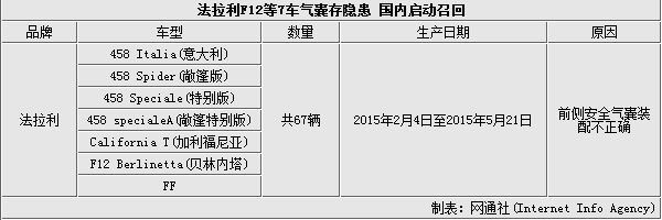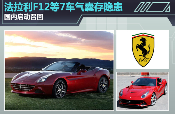 法拉利作为世界闻名的赛车及跑车制造厂商,在赛道上取得许多不凡的成绩。旗下的多款车型借鉴了F1赛车的设计风格和造车理念,并获得众多车迷的追捧。近日,网通社从国家质检总局缺陷管理中心了解到,因驾驶员前侧安全气囊装配不当,气囊将会以错误的方向打开。法拉利将在华召回458、California T、F12 berlinetta和FF等7款车型。据统计,国内共涉及67辆。