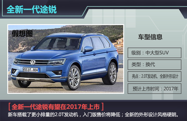全新途锐的设计灵感来自CrossBlue概念车,新车外观更为高档大气,其有将基于MLB Evo平台打造,该平台采用轻量化设计,车身将相比现款大幅减重。动力方面,新车或搭载源自Q7的3.0 TDI发动机和大众的EA888 2.0T发动机,还将推出插电混动版,采用各种柴油机或汽油机。新车预计将于2017年下半年在法兰克福车展全球首发。