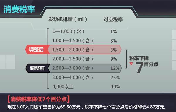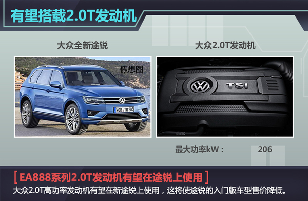 新车搭载的小排量发动机源自于EA888系列发动机2.0T的高功率版本,此发动机将先应用在即将发布的全新一代帕萨特上,其最大功率206kW。目前途锐所搭载的发动机排量为3.0L,因车型所搭载大排量的发动机令其在国内的消费税为车价的12%,换搭2.0T小排量发动机之后,所需要支付消费税将进一步降低,消费税税率将从原先3.0L排量的12%降低7个百分点,现在3.0L入门版本途锐官方指导售价为69.50万元,将来搭载2.0T发动机后,入门售价将有望低于65万元。