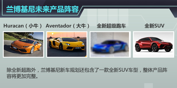 目前兰博基尼旗下车系分为Aventador(大牛)及Huracan(小牛),但随着全新超跑的推出,产品阵容将更加丰富,满足车迷在传统动力系统操控体验及全新混动技术驾驶感受两方面的需求。同时,新车凭借混动系统带来的出色动力表现与操控特性,使兰博基尼在面对与其他超跑品牌的竞争时获得更多竞争优势。除全新超跑外,兰博基尼新车规划还包含了一款全新SUV车型,整体产品阵容将更加完整。