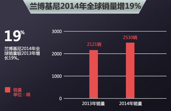 2014年,兰博基尼全球销量为2,530辆,较2013全球总销量2,121辆,同比增长19%。随着两款全新车型的推出,整体销量表现有望向更高的台阶迈进。(网通社2015年8月17日北京报道)