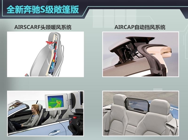 从效果图来看,新车将采用电动收折多层帆布软顶,软顶的整体造型与S级轿跑车的车身造型十分相似,但长度略长以提供必要空间容纳软顶。此外,新车将配备AIRSCARF头颈暖风系统和AIRCAP自动挡风系统,能有效减少车内乱流,为乘客创造一个温暖舒适的空间。