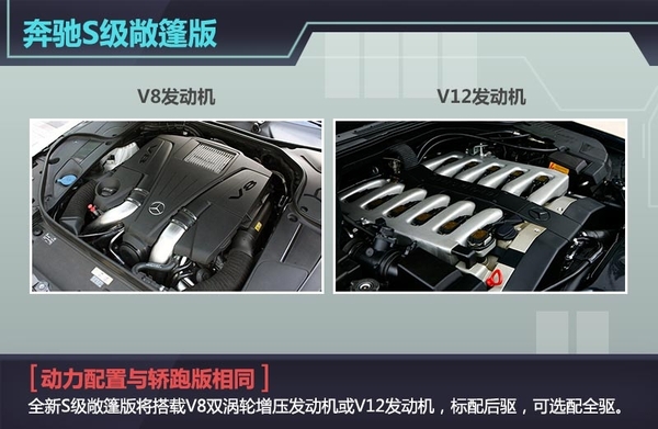 动力方面,全新S级敞篷版的发动机配置与S级轿跑版配置相同,搭载V8双涡轮增压发动机或V12发动机,标配后驱系统,部分车型可选配全驱。此外,奔驰明年将推出S63和S65两款车型。