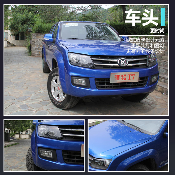 车头的外观造型,骐铃T7借鉴了不少欧式皮卡设计元素。车头横拉式镀铬前格栅简单直叙的贯穿了两侧灯组和江铃轻汽集团logo,毫不拖泥带水的设计,加强了整车识别度。前雾灯采用了和前灯组类似的造型,美观程度和整体性都增强了不少。发动机盖上隆起的线条也经过了“掰弯”调整,更具自然和力量感。