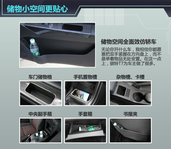中控区的储物空间也有大幅提升,手机槽、杂物槽、卡槽都有序的集成到了中控区部分,相信可以帮助车主在长途路程中,减少不少繁琐的取物置物麻烦。手套箱和中央扶手箱的空间也明显经过扩容,三瓶瓶装水完全没有压力。后排书报夹得以保留而且深度增加不少,为后排的乘客提供了更多的空间可能性。这样的设计并不需要增加多少成本,但使得骐铃T7脱离了传统皮卡的“傻糙楞”的空间设计,开始关注人的需求,这点值得表扬。