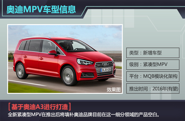 对于奥迪品牌未来的产品规划,奥迪研发部门总监Wolfgang Durheimer此前在接受采访时曾表示:“奥迪在家庭用车的进步空间还有很大的潜力,但奥迪家庭用车也必须很有奥迪特征。”众所周知,紧凑型MPV是属于家庭用车范畴的,目前在这一领域“德系三强”中的奔驰和宝马两大品牌均已布局了相应的产品,而从Wolfgang Durheimer先生的话术中不难发现,奥迪也将通过新车填补这一细分市场的空白。另据了解,奥迪全新紧凑型MPV将有望在2016年推出。
