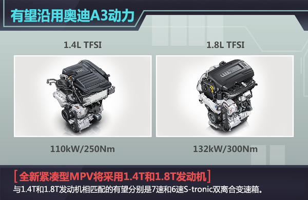 由于奥迪全新紧凑型MPV将与奥迪A3采用同样的架构进行打造,由此推测两车在动力系统方面也将得到共享。也就是说,目前已在奥迪A3和Q3以及大众品牌多款车型上得到广泛应用的EA211系列1.4T高功率发动机将在新车上得到使用。这款发动机最大功率110kw、峰值扭矩250Nm,具有优异的燃油经济性和动力表现。另外,最大功率132kW、峰值扭矩可达300Nm的第三代EA888系列1.8T发动机预计也将提供给这款全新的MPV车型。另外,在传动系统方面,新车将有望在1.4T和1.8T车型上分别匹配S-tronic 7速和6速双离合变速箱。