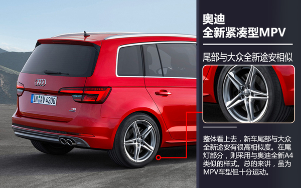 在外观造型设计上,奥迪全新紧凑型MPV就像是奥迪全新一代A4和大众全新一代途安的“结合体”。总的看上去,新车与大众全新途安十分相近,但车灯、中网以及外后视镜等细节之处则又与奥迪全新一代A4神似。犀利的头灯采用双折线造型的日间行车灯,而矩阵式的全LED大灯具有对向车灯识别功能,在提升照明效果的同时提升了安全性。另外,通过效果图可以看到,奥迪全新紧凑型MPV采用了双五辐铝合金轮毂和单边共两出镀铬排气。虽为一款强调实用性的家庭用MPV车型,但不得不说有着十足的运动感。