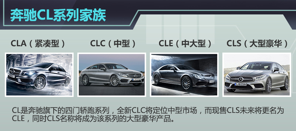 CLC作为奔驰旗下全新的四门轿跑系列,未来推出后,将成为继CLA和CLS之后,第三款产品。而根据该品牌未来的相关规划,由于现款CLS定位于中大型市场,因此换代后将更命为CLE,而未来CLS将成为基于S级所打造的大型豪华四门轿跑车。(网通社2015年8月19日北京报道)