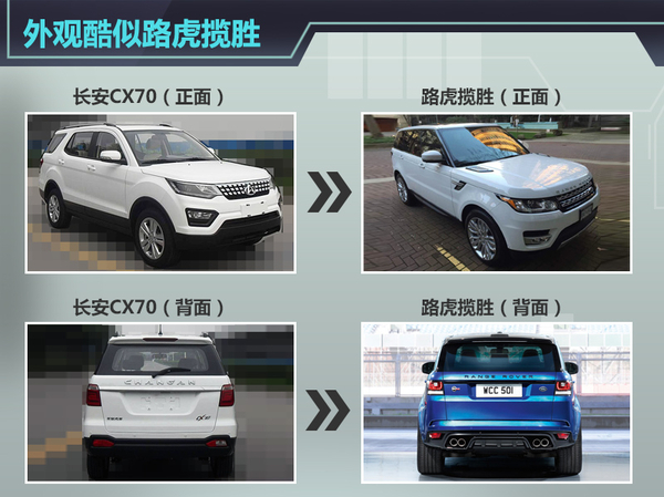 从外观来看,长安CX70方正的车身、前格栅采用悬浮式镀铬装饰以及C柱后的异色小车窗,加上一条贯穿车尾的镀铬横条和横条上的英文标识(CHANGAN),都极其酷似全新路虎揽胜。尺寸方面,长安CX70长宽高分别为4680*1800*1750mm,轴距达到2780mm,超过即将上市的长安CS75四驱版。