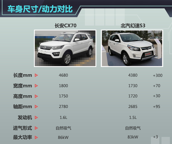 不同于长安CS35、CS75,长安商用推出的CX70将主打经济实用性,结合未来市场定位,新车将竞争对手锁定在北汽幻速S3上。参考申报图中CX70的车身尺寸,相比幻速S3尺寸有较大优势。动力方面,幻速S3主打的1.5L发动机最大功率83kW,最大扭矩150Nm,与长安1.6L发动机动力相近。(网通社2015年8月20日北京报道)