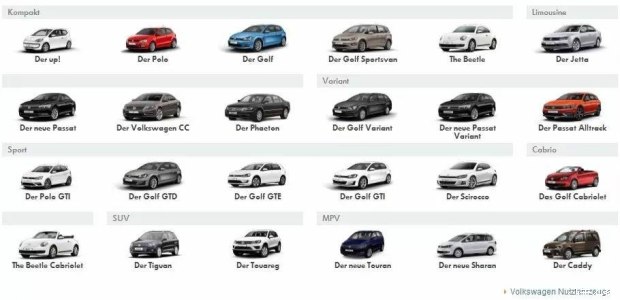 那么哪一点才是构成神车的决定性因素?在我看来很可能是泛用性。如果一款车能自己或者靠变种胜任通常消费者的各种需求,那么它就能在天时地利时成为一款神车。这样说可能有点不直观,不过你看了大众德国官网的车型列表你可能会发现,大众其实是个以卖高尔夫为主要业务的公司。
