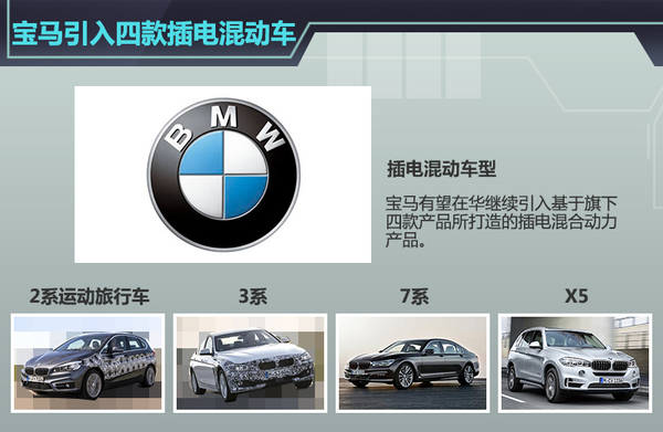 目前宝马在华已推出了宝马i3、i8和530Le在内的三款新能源产品,并随着中国及各地方政府对于新能源产品扶持力度的加大,增加了宝马对于该领域发展的信息,其中插电混动作为目前最为畅行的新能源动力方案尤为突出。近日,网通社从宝马官方了解到,宝马将进一步扩充其在中国市场的插电混动阵营。并根据目前该品牌公布的相应规划,基于2系运动旅行车、3系、7系以及X5所打造的4款插电混动产品或将系数引入国内市场销售。