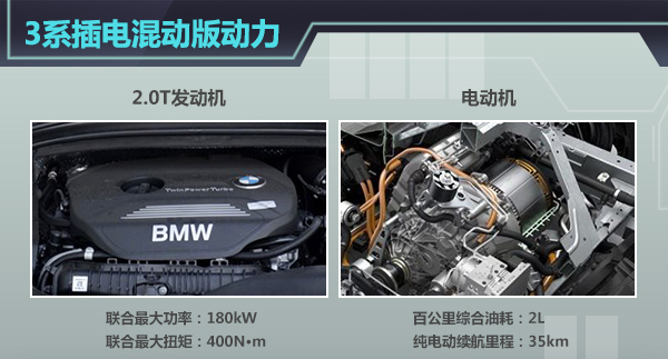 宝马3系插电混动版基于新款宝马3系打造,外观方面这款车与新款3系区别不大。动力方面预计新车搭载由2.0T发动机所组成的插电混动系统,综合最大输出功率为180kW,最大扭矩为400Nm。传动方面配备一台8速Steptronic变速箱,百公里油耗仅2L,在纯电动模式下可行驶35km。此外,新车所配备的锂离子电池可通过普通家庭电源(德国标准)充电,预计3.5小时可充满。