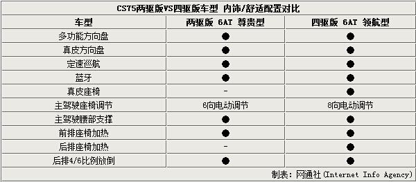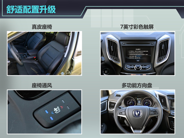 CS75四驱版内饰依旧没有大变化,不过在配饰上升级明显。如果说此前推出的CS75没有真皮座椅是一大遗憾的话,这一遗憾在CS75四驱版领航型上得到弥补。定速巡航、多功能方向盘等实用性配置依旧在四驱版车型上得以延续。此外,新车还新增了舒适性配置,在前排座椅加热的基础上,后排座椅也增加了这一功能,这在同级别车型中并不多见。此外,6向电动调节驾驶员座椅升级为8向调节。