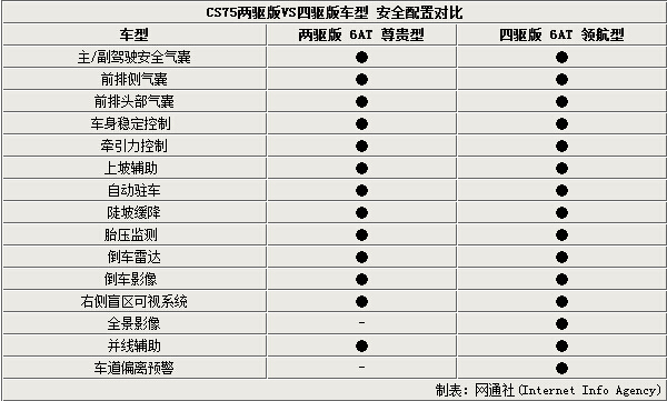 CS75两驱版在安全配置上已有较好基础,四驱版车型在这一项上变化并不大。6安全气囊能提供全方位被动安全保护;电子车身稳定系统、胎压监测系统、ESP电子稳定系统、并线辅助系统等配置也为行车安全提供保证。CS75四驱版安全配置最大的变化是升级的全景影像系统。360度无死角的全景影像系统能为停车起步提供更大的便利和安全保障。此外,四驱版领航型还搭载了车道偏离预警系统。