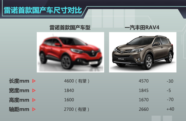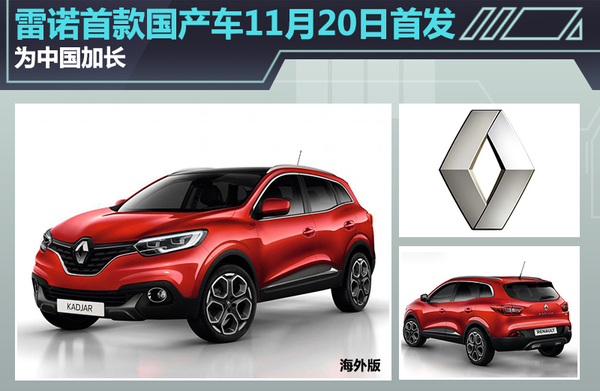 根据雷诺此前规划,明年雷诺将会集中推出两款SUV车型,其中有一款将定位于紧凑级SUV,该车型与日产全新逍客基于同平台打造,车型尺寸略大于全新逍客。近日,网通社从东风雷诺内部人士获悉:雷诺首款国产车型将于11月20日正式亮相。据此前了解,雷诺股份公司已注册了“科雷嘉”商标,而该款雷诺国产SUV则有望采用此商标,并且国产后车身会专门为中国市场而进行加长。