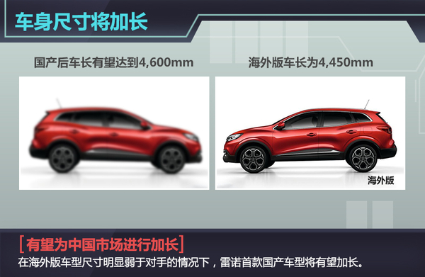 尺寸方面,海外版雷诺Kadjar长宽高分别为4450/1840/1600mm,轴距为2606mm,离地间隙约为190mm,相比国内同级别市场中的奇骏、RAV4、途观、翼虎等车型,该车在数据方面不占优势。所以雷诺Kadjar在国产后有望在车身上进行加长,长度或将达到4600mm,从而提升在国内市场同级别市场中的地位。