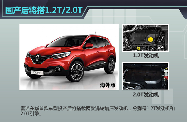 雷诺“科雷嘉”是继科雷傲和Captur之后,雷诺家族旗下推出的第三款SUV。这款新车将作为东风雷诺的首款国产车型。该车在外观方面相比海外版本没有过多变化,在动力方面将有望搭载1.2T、2.0T涡轮增压两款动力总成,与两款发动机相匹配的是6速手动以及CVT变速器。新车将有望提供前轮驱动和适时四驱两种形式。