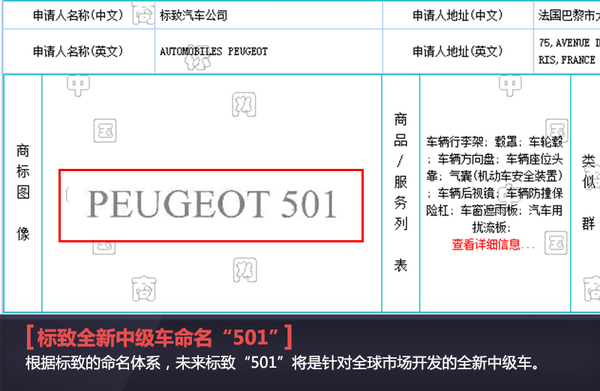 标致雪铁龙集团此前开发了全新EMP2平台,基于此平台可打造包括紧凑级、中级车在内的多款车型。随着EMP2平台的使用,标致与雪铁龙品牌将有更多全新及换代产品推出。近日,网通社从国家工商行政管理总局商标局获悉:标致已经在华注册了“501”商标,根据标致品牌的命名体系,首个数字代表级别,8”是现有成熟产品及其换代产品的尾数代码,“1”则代表针对全球市场开发的全新产品。因此,这款车有望是标致基于EMP2推出的全新中级车,此外该车也有望在华投产,进而加强其在中级车市场的竞争力。