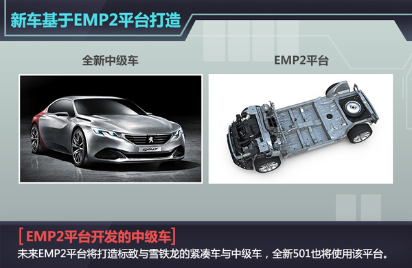 PSA集团旗下的EMP平台全称为Efficient Modular Platform(高效模块化平台),紧凑级以及中型车将基于EMP2平台打造,而未来将推出的501车型就将在这个平台上打造。作为第二代高效模块化平台,EMP2优化了材质和结构,加入强度更高的钢材与铝材应用比例。