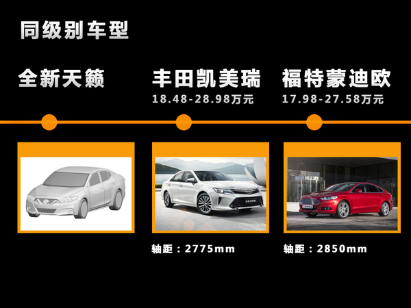 目前在B级车市场中丰田凯美瑞和福特蒙迪欧表现出色,值得一提的是,丰田凯美瑞轴距为2775mm,福特蒙迪欧轴距则为2850mm,而全新天籁的轴距有望超过这两款车。就价格上来看,现款天籁价格区间为17.78-29.96万元,这与丰田凯美瑞和福特蒙迪欧售价相差无几。未来全新天籁引入国内后将锁定这两款车为竞争对手,新车升级的外观和动力将很大程度上提高竞争力,日产全新天籁上市后的表现值得期待。(网通社2015年8月21日北京报道)