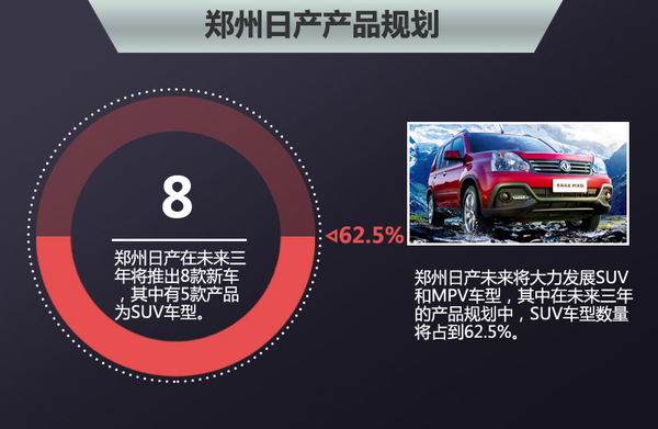 到2016年,郑州日产将形成“3+2+E”的商品矩阵。“3”是指形成3个年产量过10万辆的明星车型,包括SUV、皮卡和CDV三大品类;“2”代表轻卡和MPV;“E”代表电动车。自2015年起,郑州日产的产品布局将进一步完善,有着三大品牌的郑州日产未来三年将总共推出8款新车型。其中包括日产品牌的一款皮卡及一款SUV车型,和东风以及东风风度品牌旗下SUV、MPV及皮卡在内的六款新车型,其中SUV车型占比超过了60%,仍占较大比重。(网通社2015年8月21日北京报道)