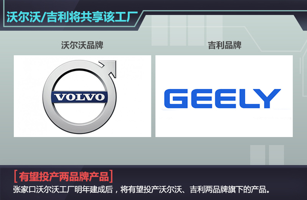 2013年8月,沃尔沃汽车集团曾宣布与吉利控股集团以合资主体成立合资公司,其中大庆和张家口两家工厂以合资公司形式运营。由此可见,吉利控股集团和沃尔沃汽车集团将在张家口工厂建成以后将共厂生产。由于沃尔沃与吉利品牌在市场中定位不同,两品牌虽然共享CMA模块化架构,但是在产品上两品牌也会根据自身的定位而有所不同。