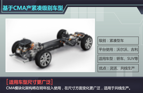 CMA平台是由吉利与沃尔沃于瑞典的中欧汽车技术中心CEVT负责开发,新平台的最大特点在于模块化生产,且灵活性很高。未来基于CMA模块化架构生产的车型均可以根据需求进而调整出不同尺寸。吉利与沃尔沃共同研发的全新紧凑级系列车型将会基于该平台打造。并且这一系列车型之间具有很高的零部件共同率。