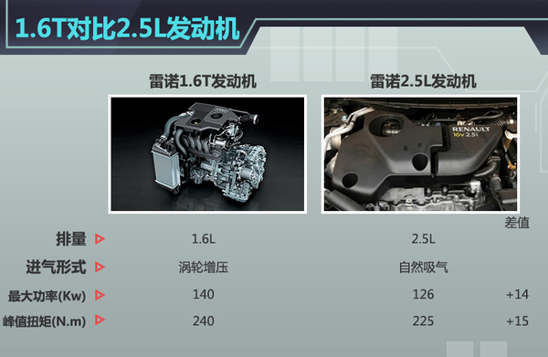 雷诺2.5L自然吸气发动机最大功率为126kW,峰值扭矩为225Nm,而新1.6T涡轮增压引擎,最大功率140kW,峰值扭矩240Nm,动力输出已经全面超越现有自然吸气发动机。未来,雷诺旗下多款车型均有望使用小排量发动机,以提高其产品竞争力。(网通社2015年8月21日北京报道)