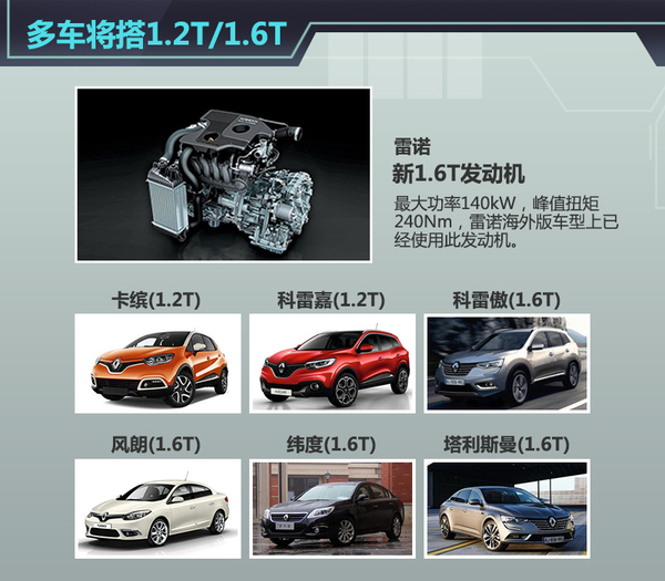 雷诺旗下车型广泛采拥老2.0L/2.5L自然吸气引擎,目前只有最新推出的小型SUV卡缤搭载了1.2T小排量发动机,其他现款车型科雷傲、风朗、纬度、塔利斯曼均使用2.0L/2.5L自然吸气发动机。而这几款车的海外版车型均已使用1.2/1.6T发动机。明年准备国产的雷诺SUV科雷嘉和中型SUV科雷傲将使用1.2T/1.6T发动机。而未来,雷诺旗下多款车型均有望采用“小排量+增压化”发动机,换代升级进入国内市场。