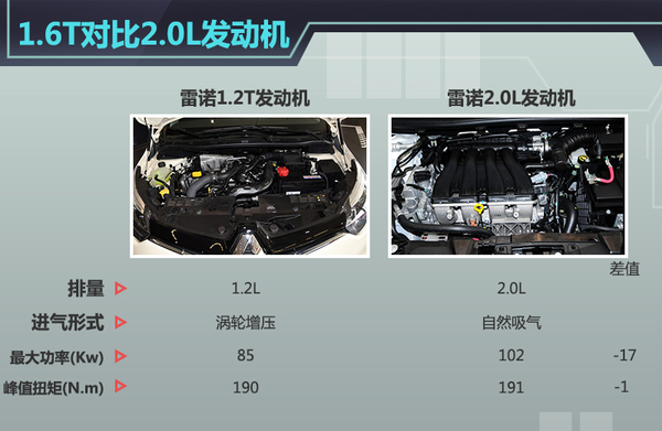 雷诺1.2T发动机最大功率85kW,峰值扭矩为190Nm,以前使用的2.0L自然吸气引擎,最大功率102kW,峰值扭矩191Nm。2.0L自然吸气发动机排量几乎是1.2T发动机排量的两倍,而两款引擎在最大功率上仅有17Kw的差距,峰值扭矩则几乎相同。