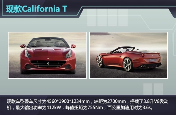 法拉利于2014年发布了新一代California T,现款车型由宾尼法利纳设计,延续了法拉利的跑车精髓,整车尺寸为4560*1900*1234mm,轴距为2700mm,搭载了3.8升V8发动机,最大输出功率为412kW,峰值扭矩为755Nm,百公里加速用时为3.6s。