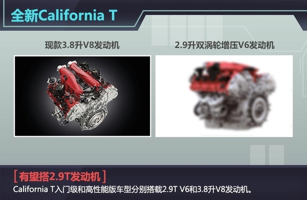 动力方面,入门级全新California T有望搭载2.9升双涡轮增压V6发动机,最大输出功率可达447kW;而高性能版则将延续现款动力配置,依旧搭载现款3.8升V8发动机,但调校后将压榨出更大动力。在搭载小排量发动机后,全新California T的售价也有望相应下调。