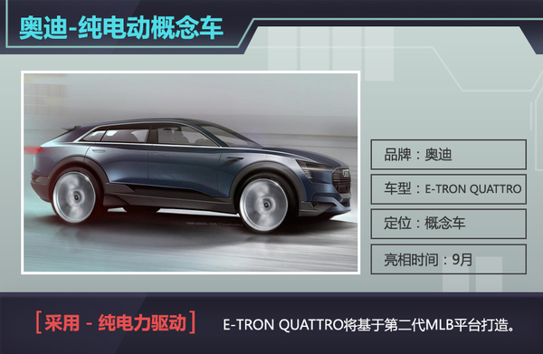 奥迪是德国知名汽车制造商,为应对能源危机的困扰以及竞争对手的挑战,从而在新能源车型的研发中加紧了步伐,并且计划推出全新新能源车款。日前,网通社从车迷世界Worldcarfans获悉,奥迪将推出一款纯电力驱动型的概念车e-tron quattro。新车将3组锂离子电池组放置在车体中央,从而驱动车辆前进,而这款全新概念车也将于下月开幕的法兰克福国际车展首度亮相。