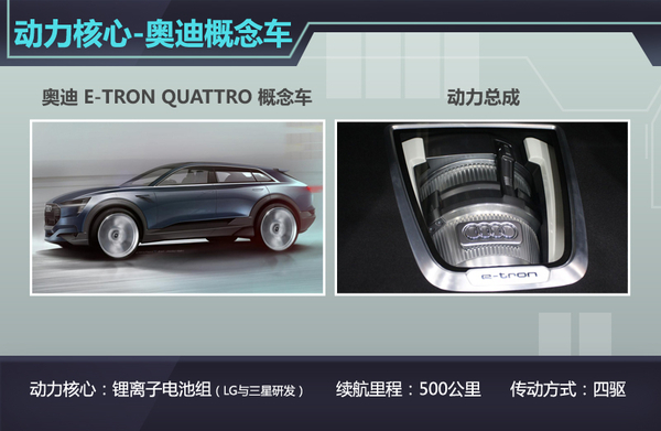 动力方面,奥迪e-tron quattro概念车将采用3组锂离子电池作为动力来源,搭载于车体中央的电池组能够为任意车轮提供驱动力,并且能够维持均等动力输出,而这也进一步诠释了全时四驱系统的定义。值得一提的是:奥迪全新e-tron quattro概念车所搭载的锂离子电池组能够维持车辆巡航行驶500公里。