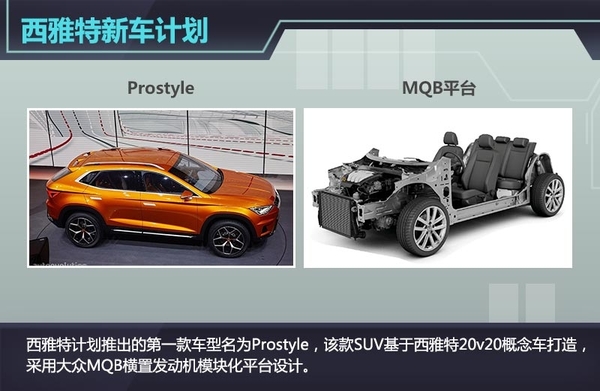 西雅特计划推出的第一款车型名为Prostyle,该款SUV基于西雅特20v20概念车打造,采用大众MQB横置发动机模块化平台设计,提供多款发动机配置,包括一款1.4升TDI三缸柴油发动机。新车预计于2016年3月在日内瓦车展亮相,并将在斯柯达捷克工厂组装。