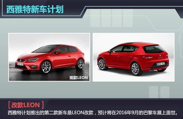 西雅特计划推出的第二款新车是LEON改款,该车预计将在2016年9月的巴黎车展上面世,共有多款车型,如3门轿跑和跨界车等。第三款和第四款西雅特新车分别是伊比飒继任车型和全新B级跨界车,这两款新车将在2017年正式发布。其中伊比飒SUV继任车型的车身长度预计为4.2m,可能基于大众MQB平台打造,并提供全驱配置,有望搭载排量为1.0升至1.4升的多款TDI三缸发动机。